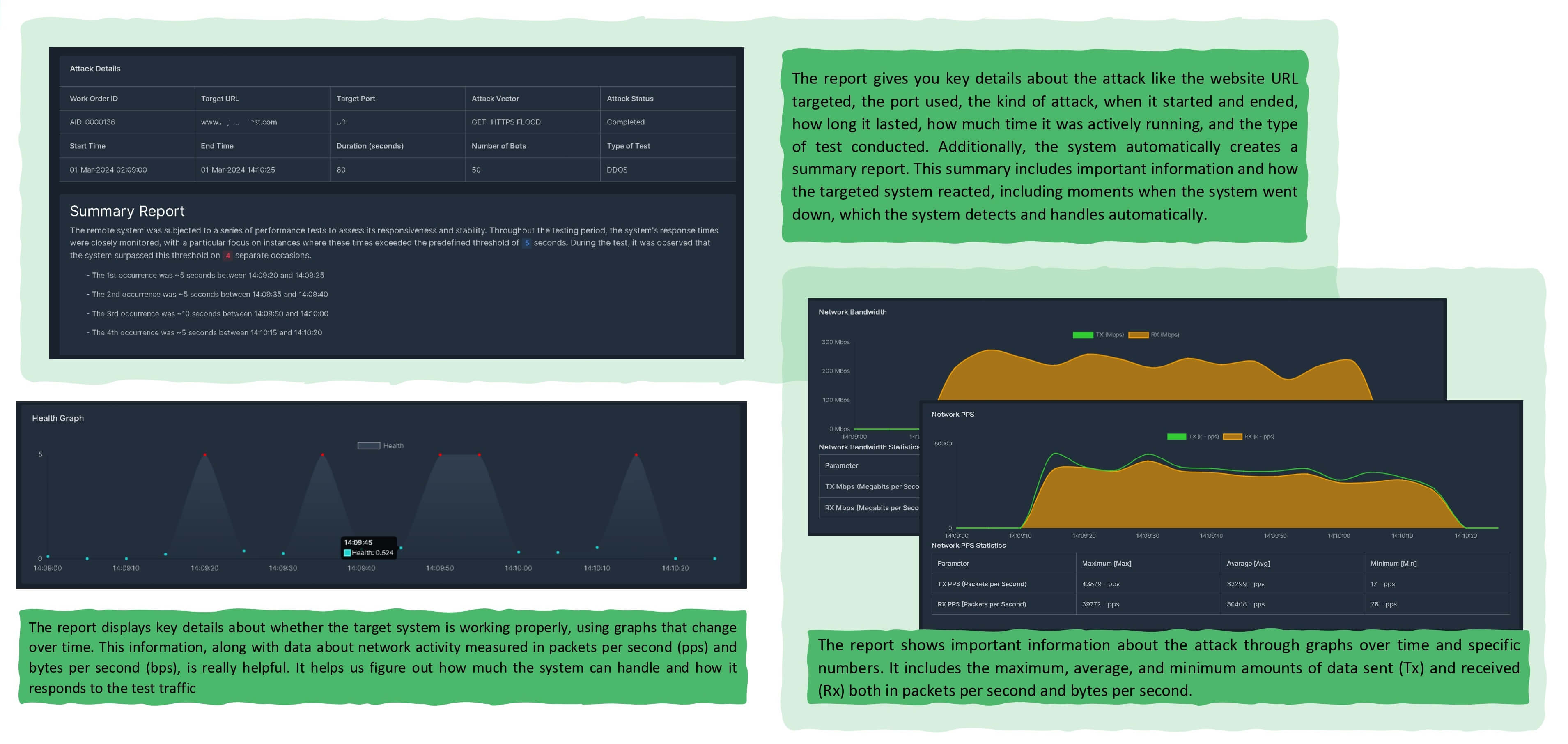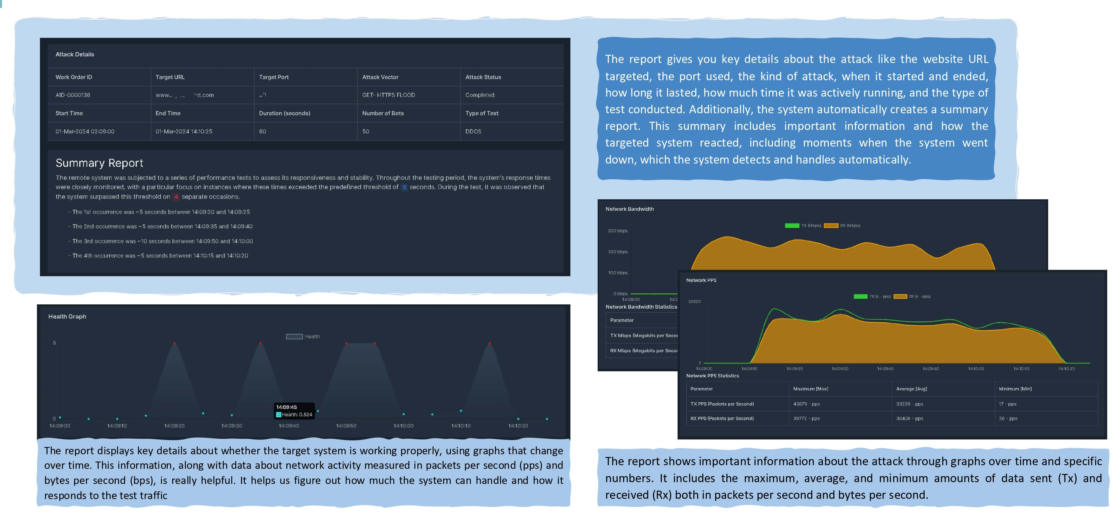 Reporting – Once testing is completed, a DDoS Test Report is created that highlights points of strengths and weaknesses of your DDoS attack handling, and recommendations for further action.
